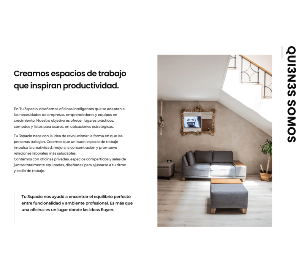 Para Tu 3spacio, desarrollamos una plataforma web robusta en WordPress que proyecta profesionalismo y modernidad. El enfoque principal fue la creación de un catálogo visual interactivo de sus oficinas y salas de juntas, optimizado para que el usuario pueda explorar las instalaciones de forma fluida.